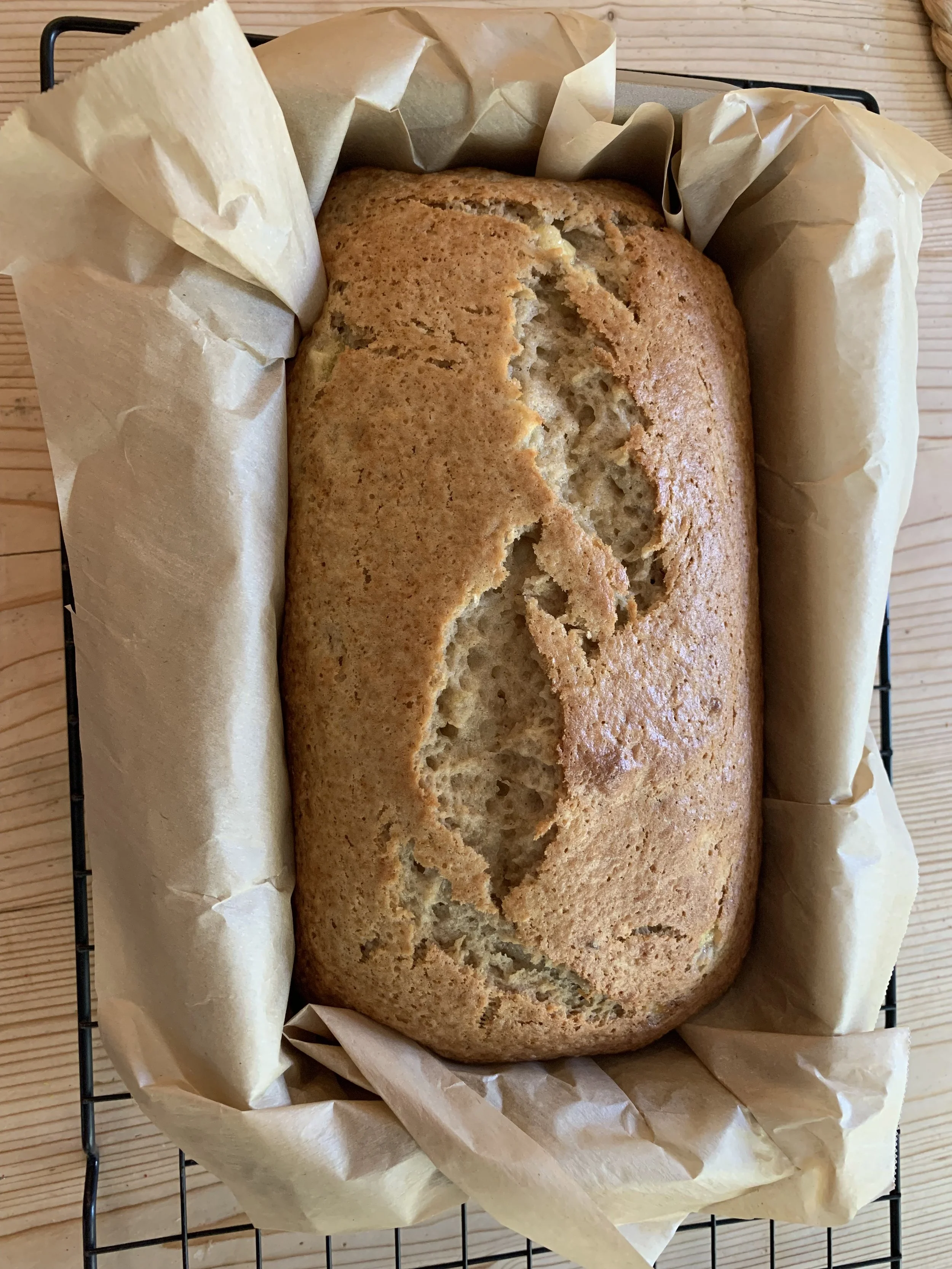 pour batter into a greased (I use parchment paper) 9x5x3” loaf pan, bake at 350 degrees for 45 minutes, cool in pan for 10 minutes, remove from pan and let cool on wire rack