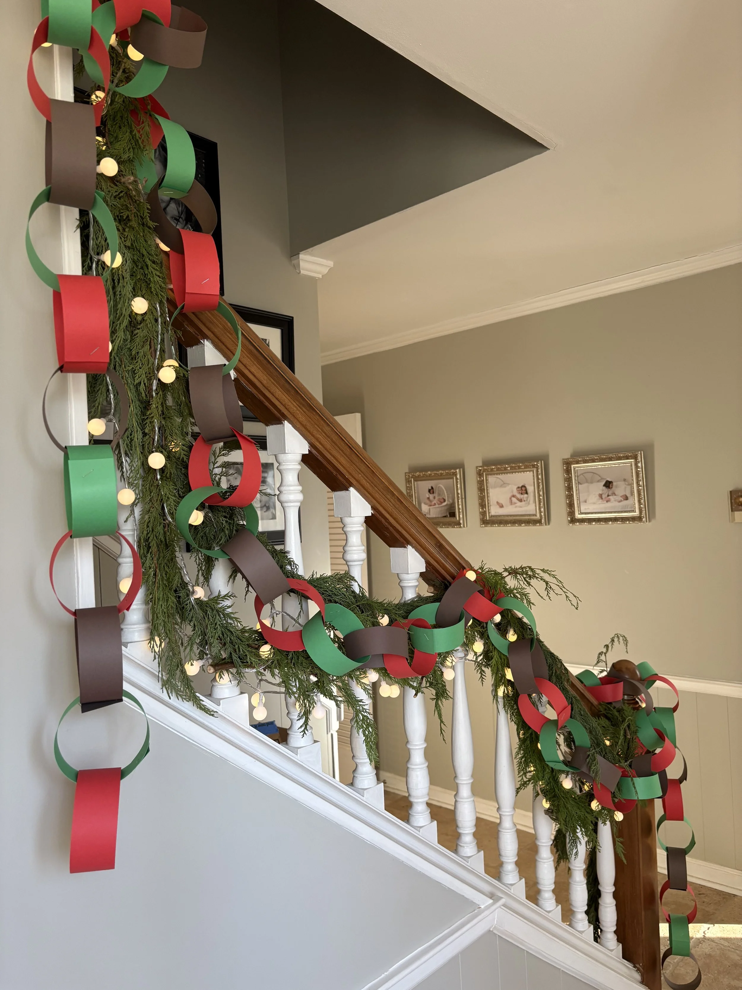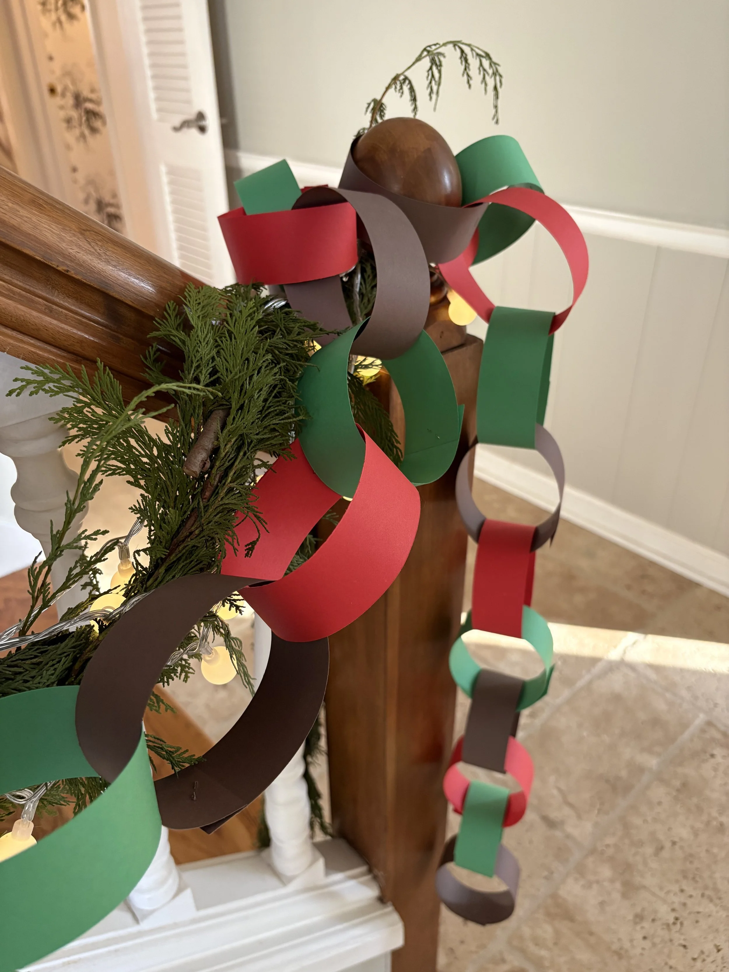 Just a little tip….I found card stock works best but you can certainly use construction paper, too. I attached all the chains either looped on the bannister greenery, corners of furniture and nails (that usually hold the stockings ;) ) I found a place in a closet to store and hang the chains for future celebrations. Can’t for Halloween!