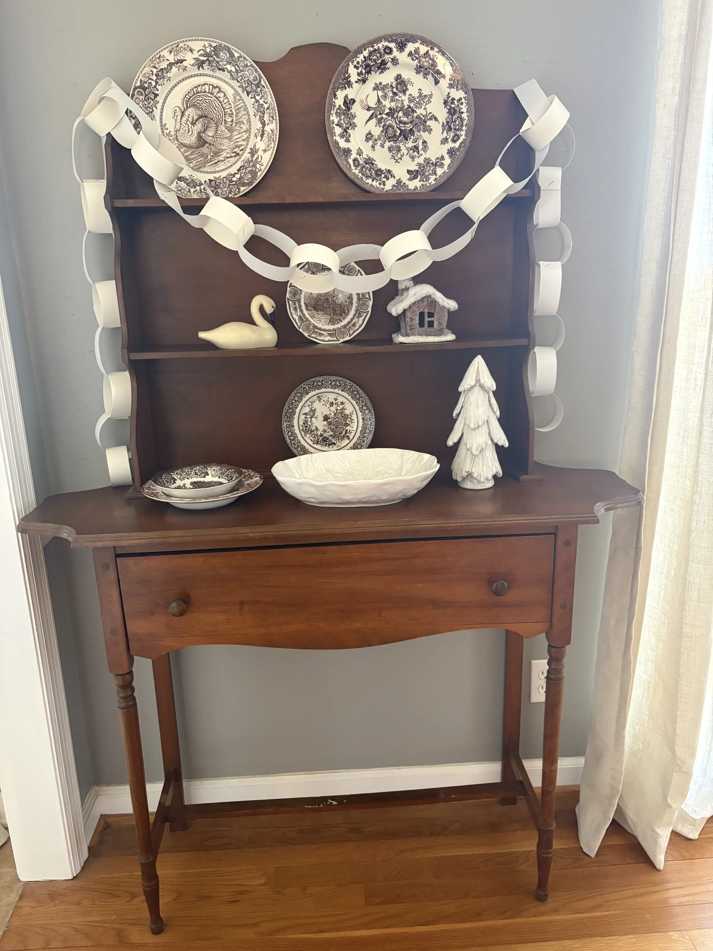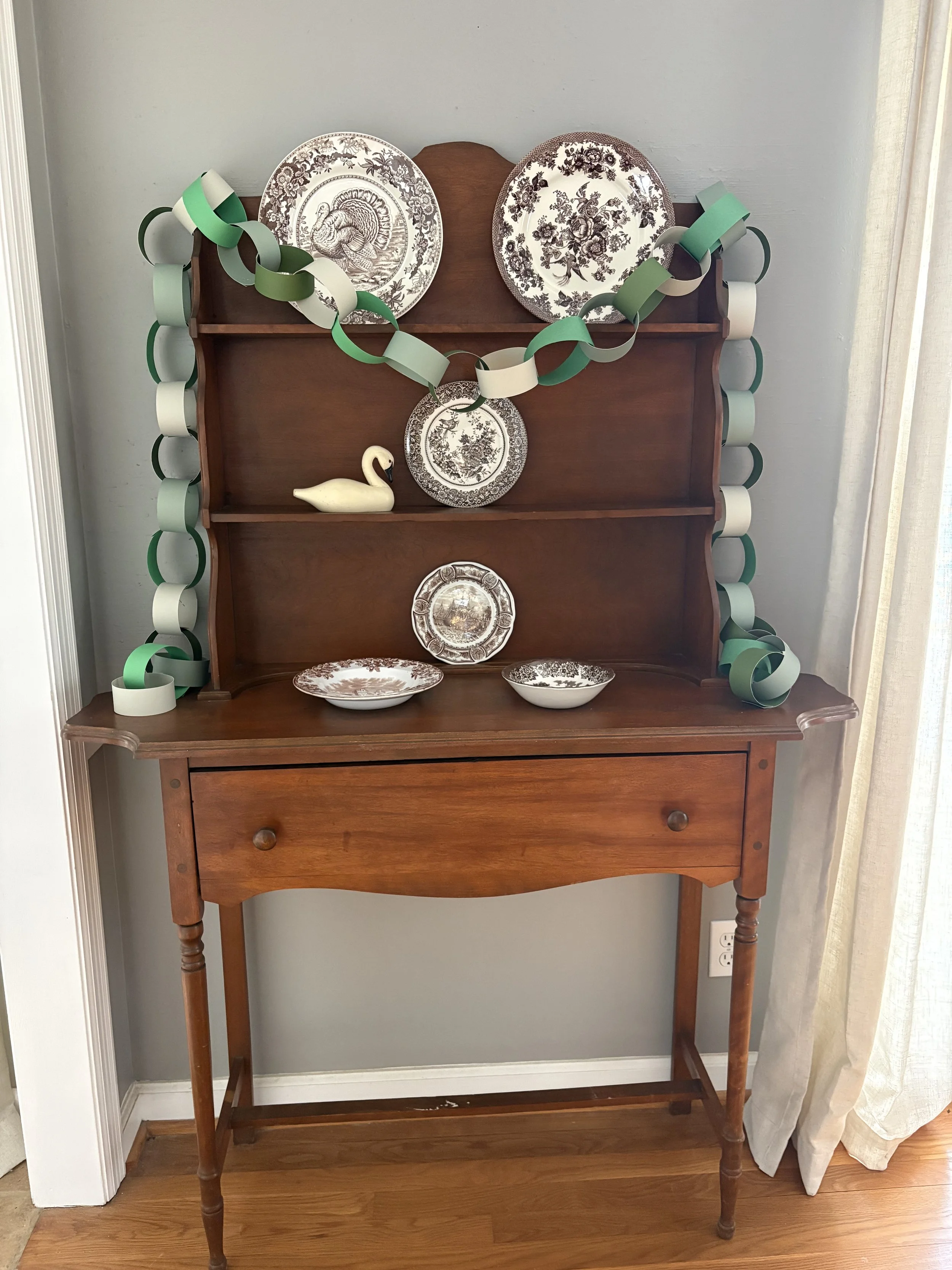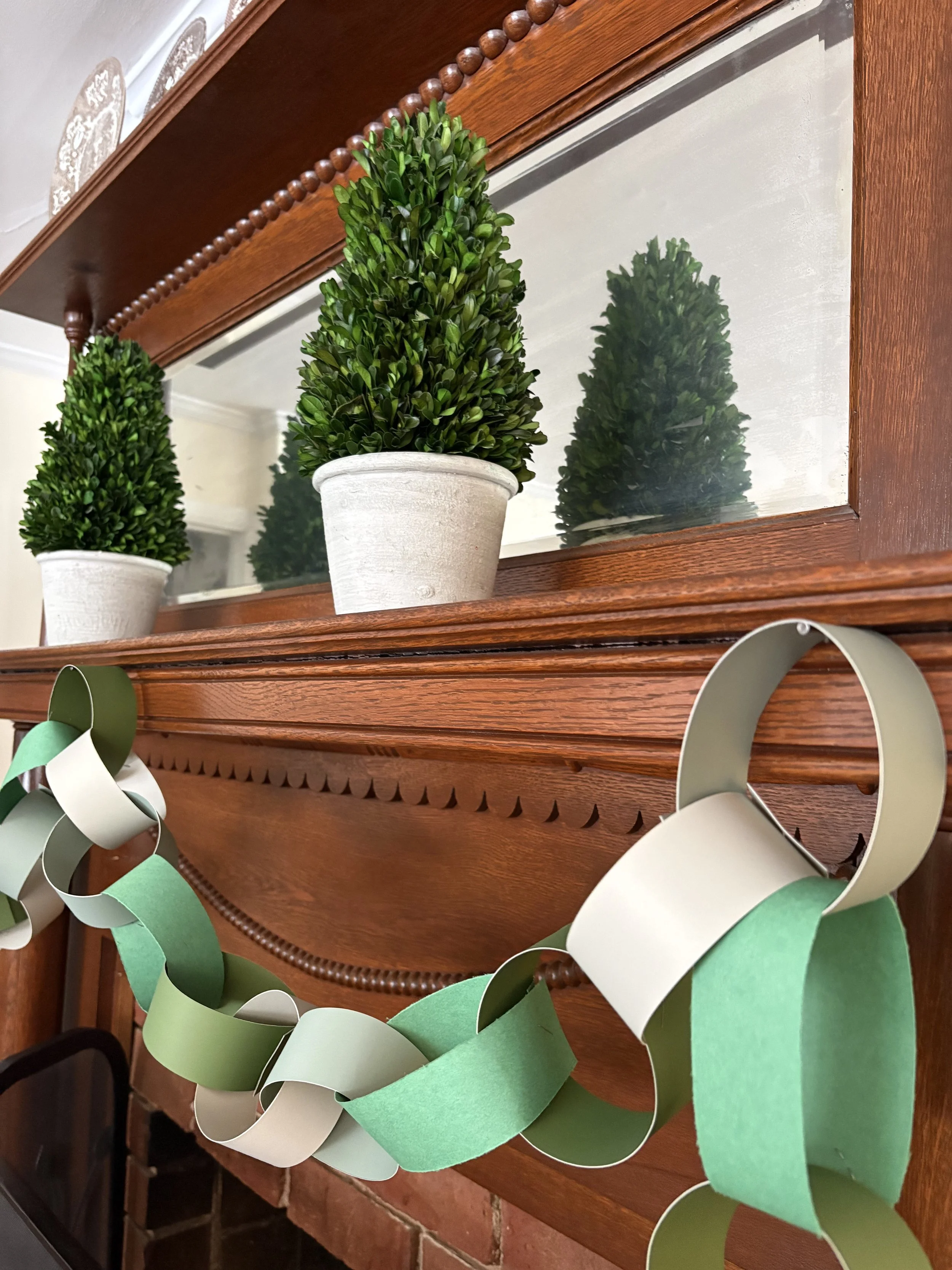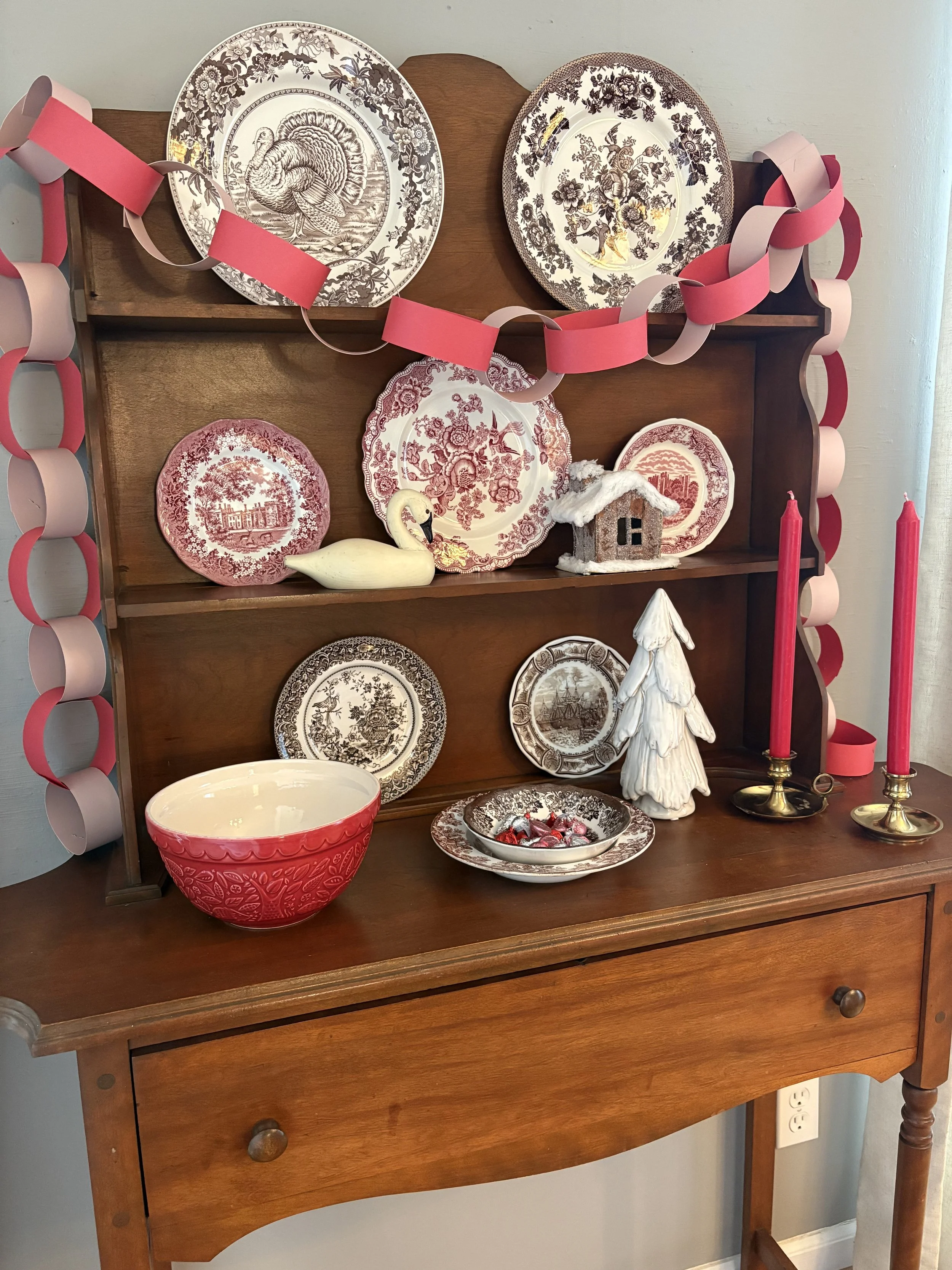 I found my new favorite “craft”. When my daughter and I were meandering through a new shop in town, she pointed out the paper chains adorning the ceiling and windows. She said they were really “in” right now. I knew the British loved decorating with them but hadn’t really thought about making them myself to use in our home. The new-found love and obsession began. I started with Christmas, moved on to winter, Valentine’s Day and St. Patrick’s Day. It’s so easy, inexpensive and festive! I ordered cardstock from Amazon and found construction paper and a paper cutter at Hobby Lobby. I simply cut strips and stapled them together and hung them on our banister, small hutch and mantle. It’s such a fun, traditional, colorful way to add a happy touch to celebrate a holiday or occasion! Warning: once you start, it may become addictive.