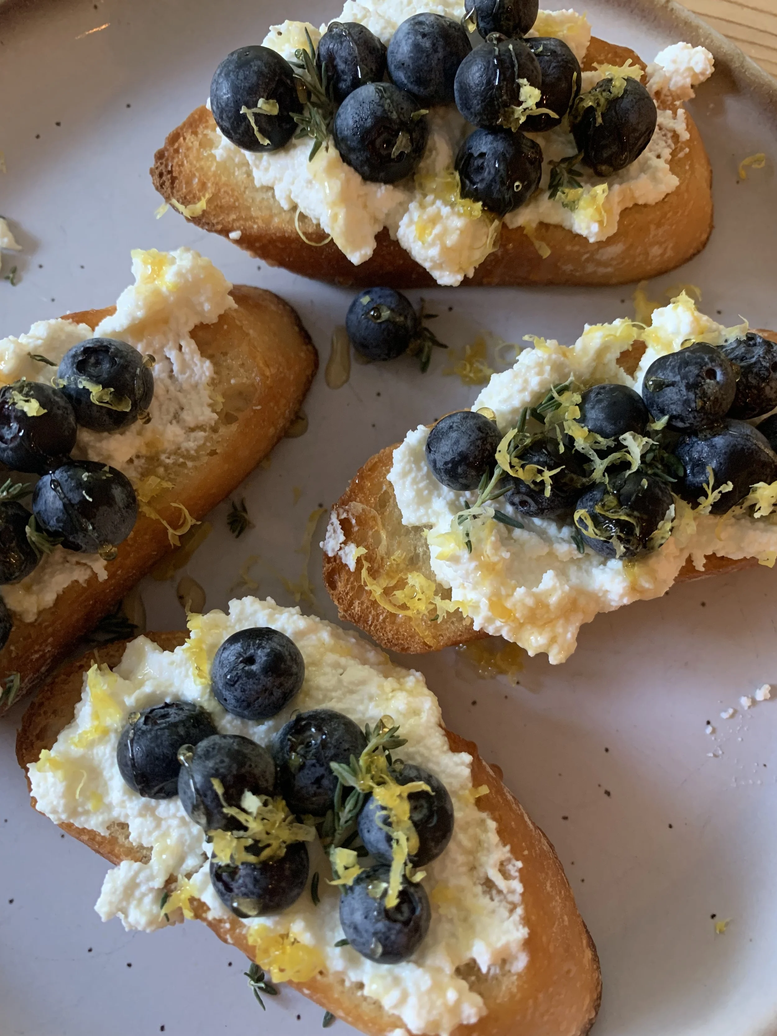 once completely cooled, spread some ricotta cheese on slices & top with blueberries, lemon zest, fresh thyme, honey and sea salt