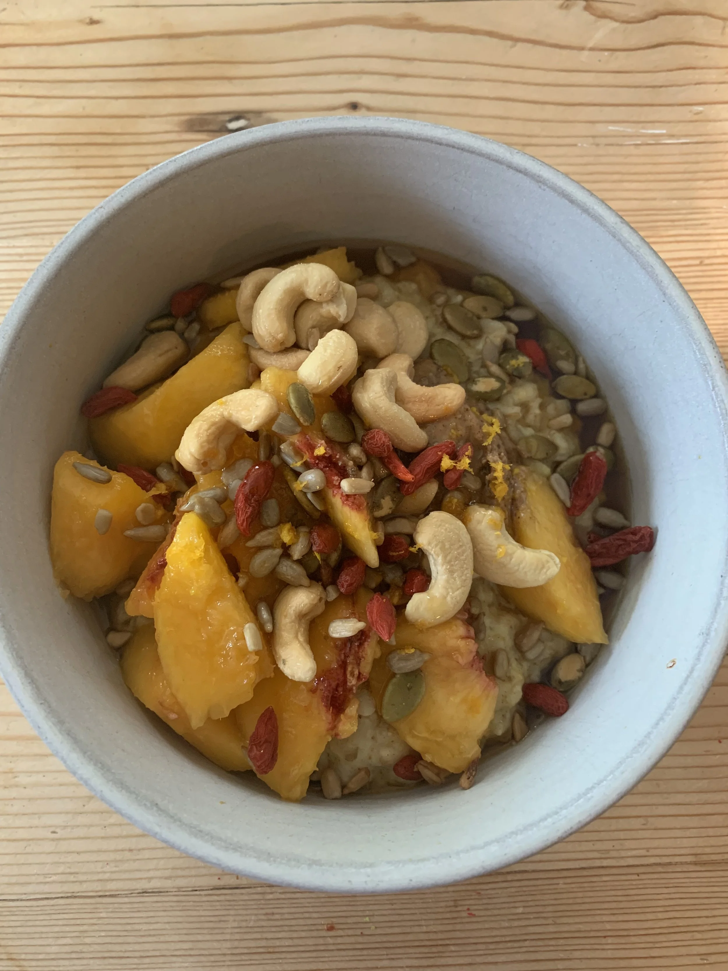 oatmeal with milk, sea salt, fresh grated ginger & turmeric, and cinnamon stirred in and topped with fresh peaches, cashews, pumpkin seeds, sunflower nuts, goji berries and maple syrup