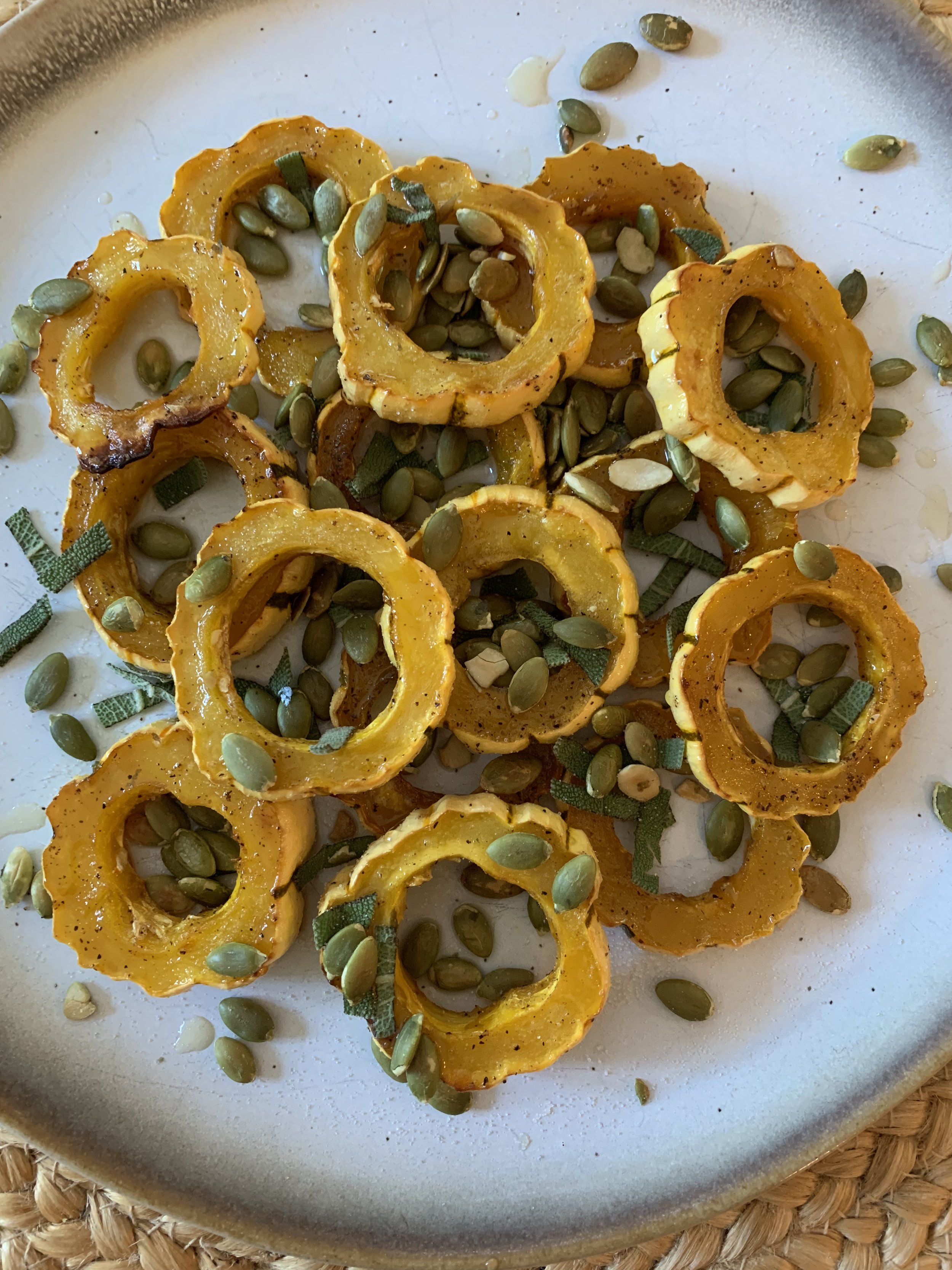 I love the change of seasons for so many reasons, such as making meals with ingredients that are now in season. As we phase out fresh corn and other summer veggies, we welcome others, like this delicata squash with pumpkin seeds and sage. It pairs nicely with roasted rosemary pork tenderloin and fresh garlic green beans.