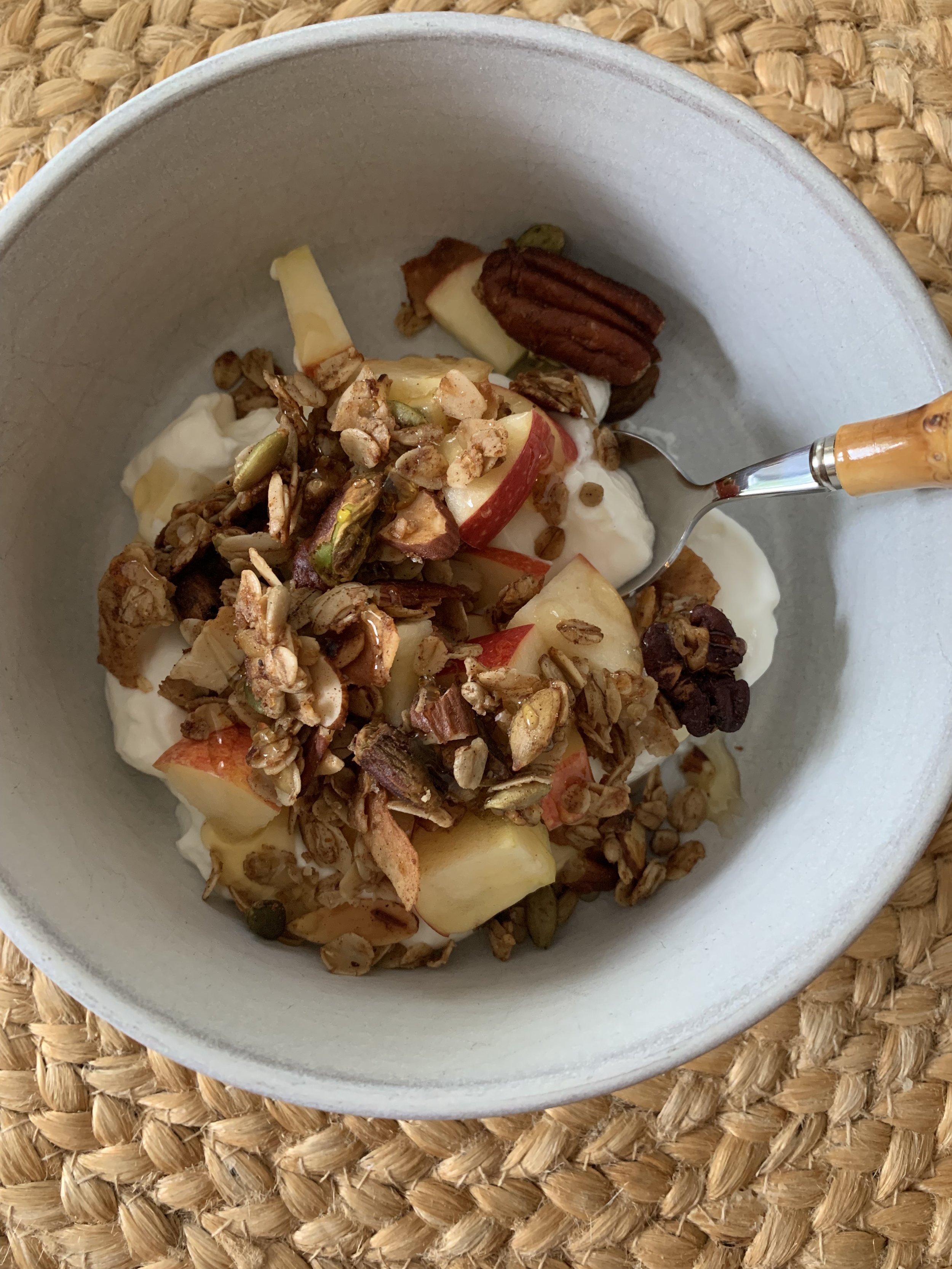 This is my favorite way to eat granola. Simply spoon your favorite yogurt into a bowl, sprinkle with any kind of fruit (I chose apple this time because it’s in season), and drizzle with honey.
