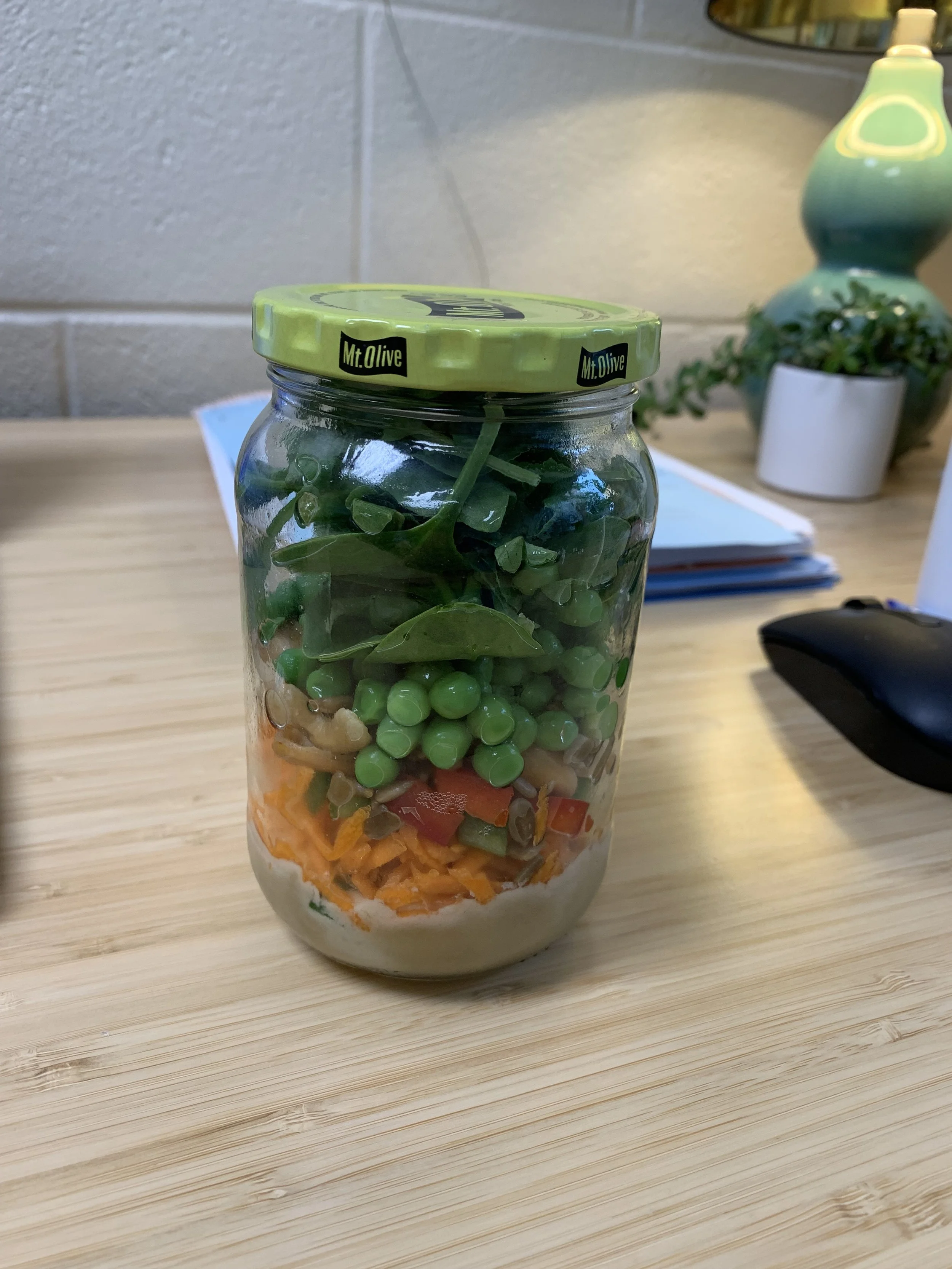 When I worked at preschool, I loved taking this easy, healthy, portable lunch to enjoy at my desk. It would be great for a picnic, too! Simply chop any veggie and fruit you like and pop in a glass jar. Make sure you put the dressing of your choice in first ( I made a simple balsamic: brown mustard, salt, pepper, lemon juice, sugar, honey or maple syrup, balsamic vinegar & olive oil), add the hard veggies/fruit next, and top with the softer foods (lettuce, spinach, micro greens).