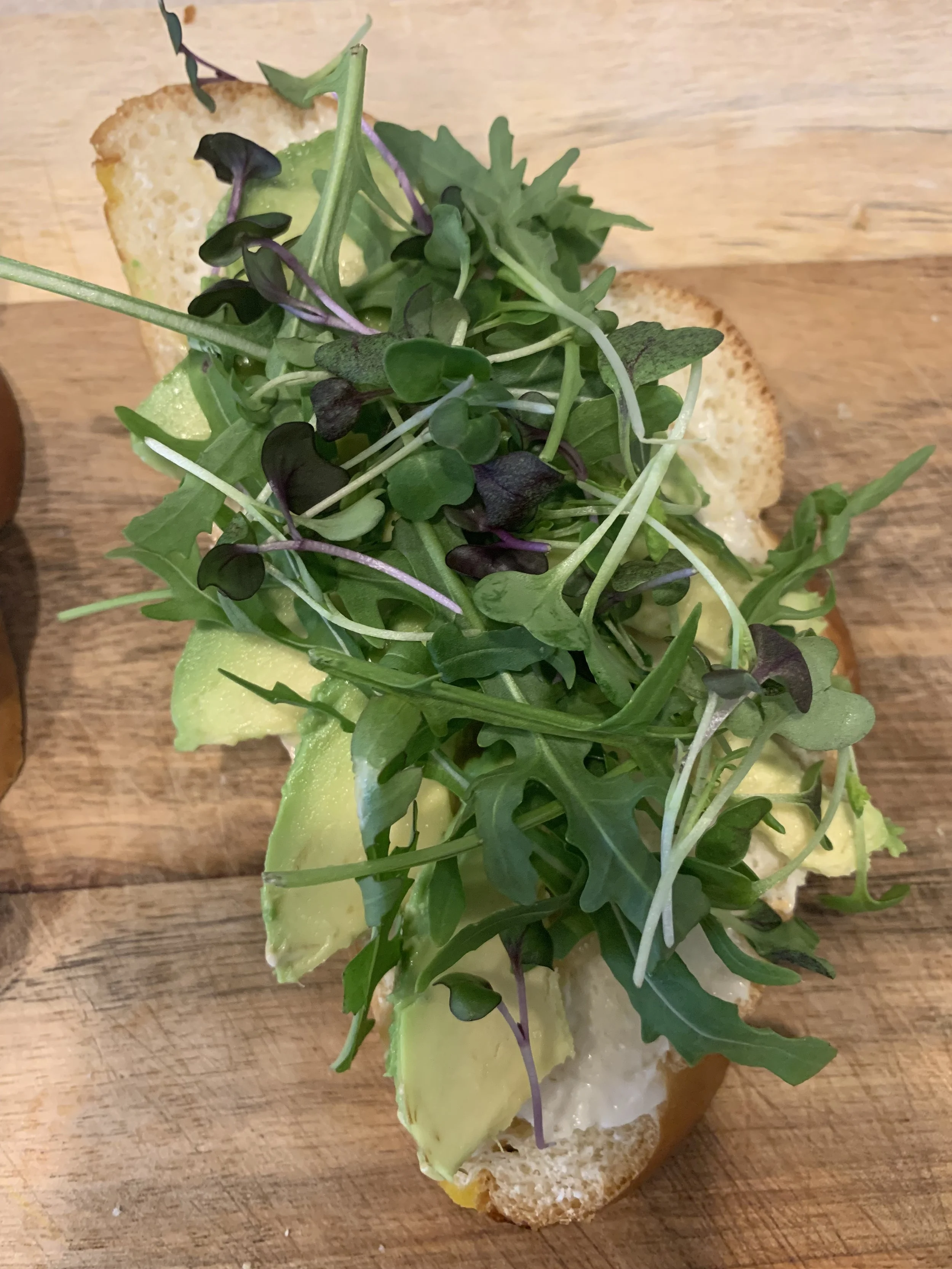 Slice a piece of store-bought challah bread (or any type of bread you like), spread Miracle Whip or hummus and top with avocado, gouda, arugula, micro greens and salt & pepper.