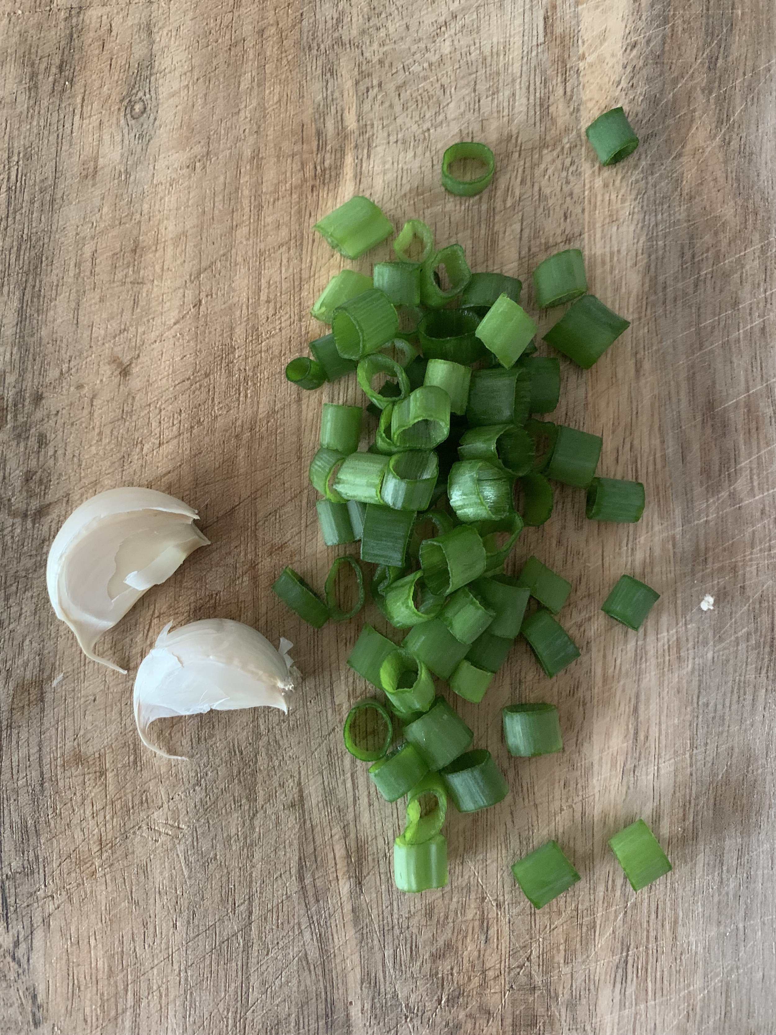 chop green onions & garlic (the garlic is for the peanut sauce recipe above) use as many onions & garlic as you like