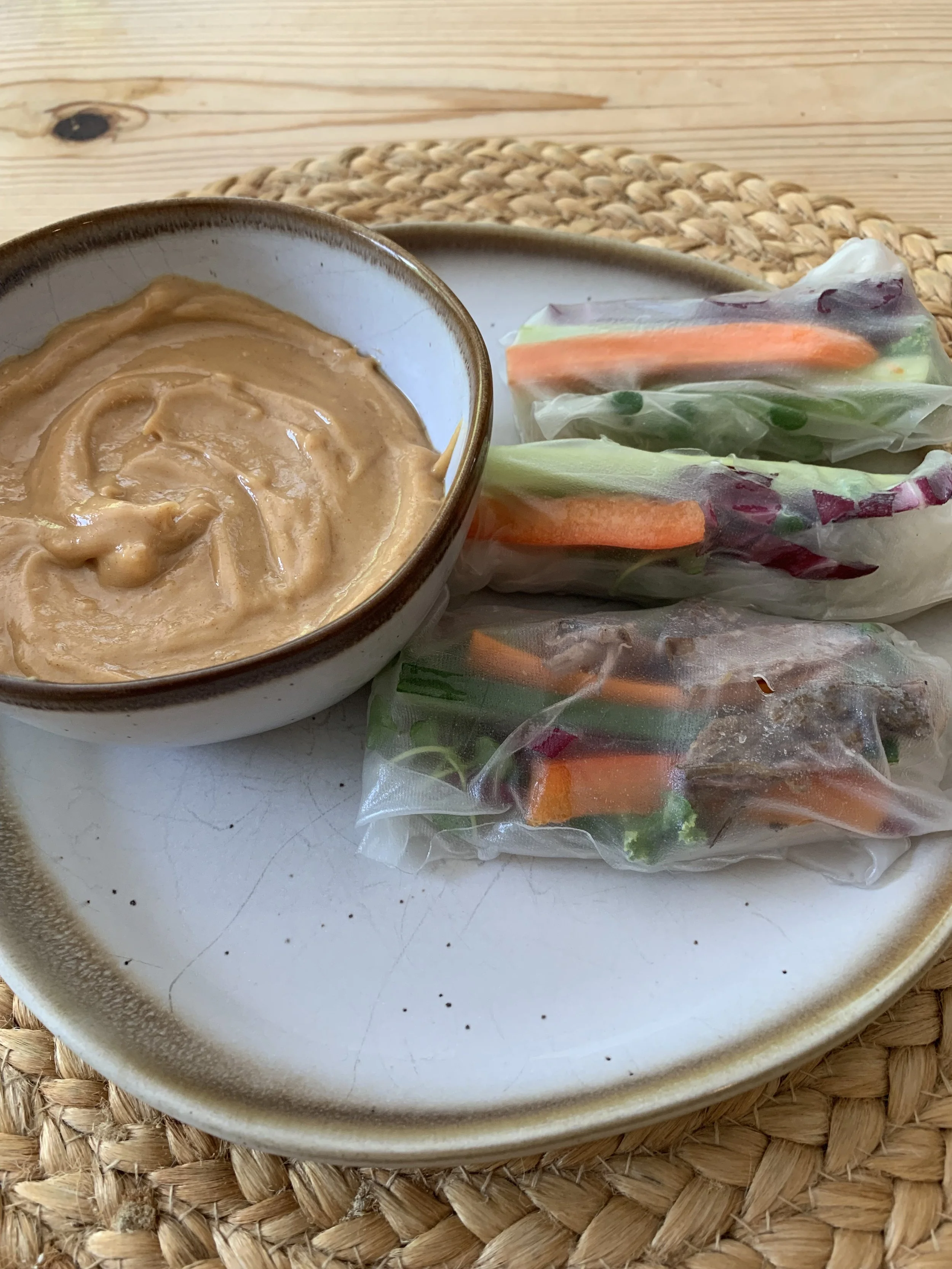dip rice paper rounds in warm water for just a couple of minutes, place on flat surface, add veggies and roll up (I had leftover steak so I added that to a couple of rolls but honestly, I liked the veggie-only ones better)