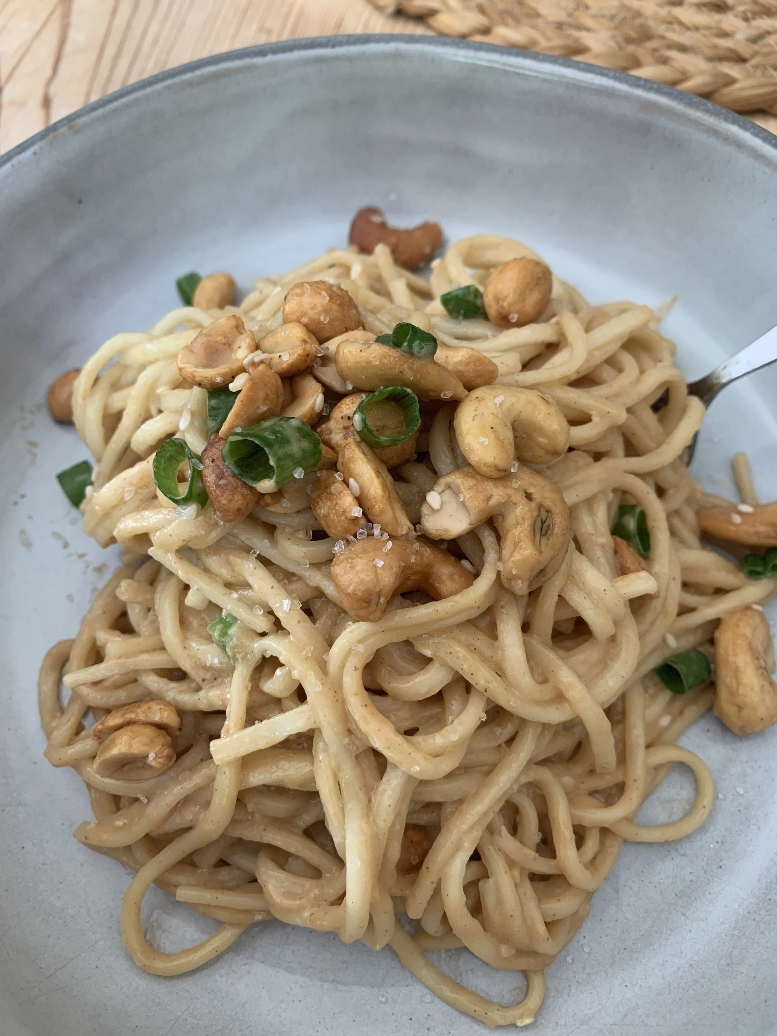 stir peanut sauce in with the noodles, top with green onions, peanuts, cashews and sesame seeds