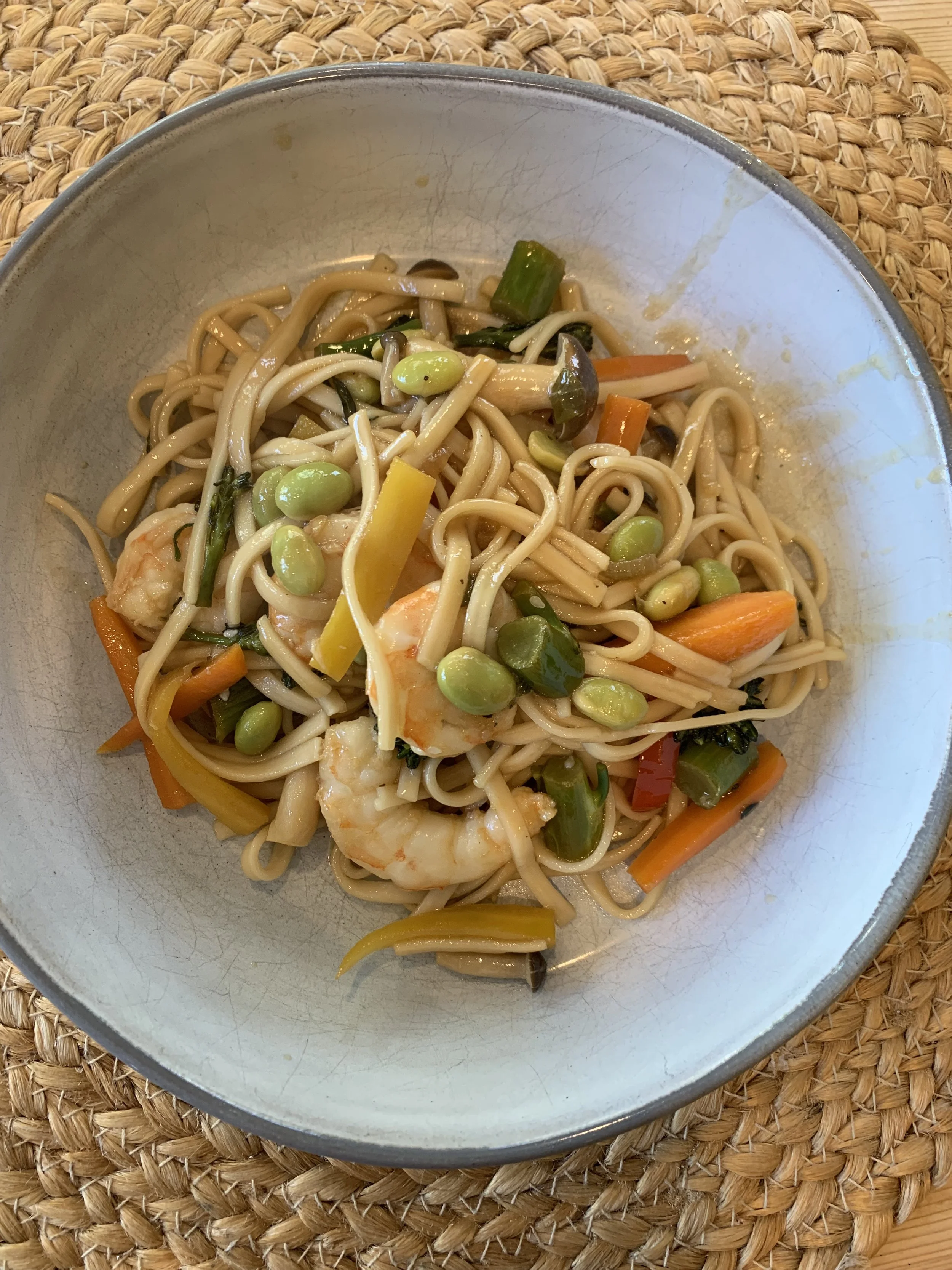 I sautéed the veg until tender, added the soy sauce and seasonings, then cooked the shrimp in the same pan until “just pink”, and lastly added the cooked noodles to the skillet.