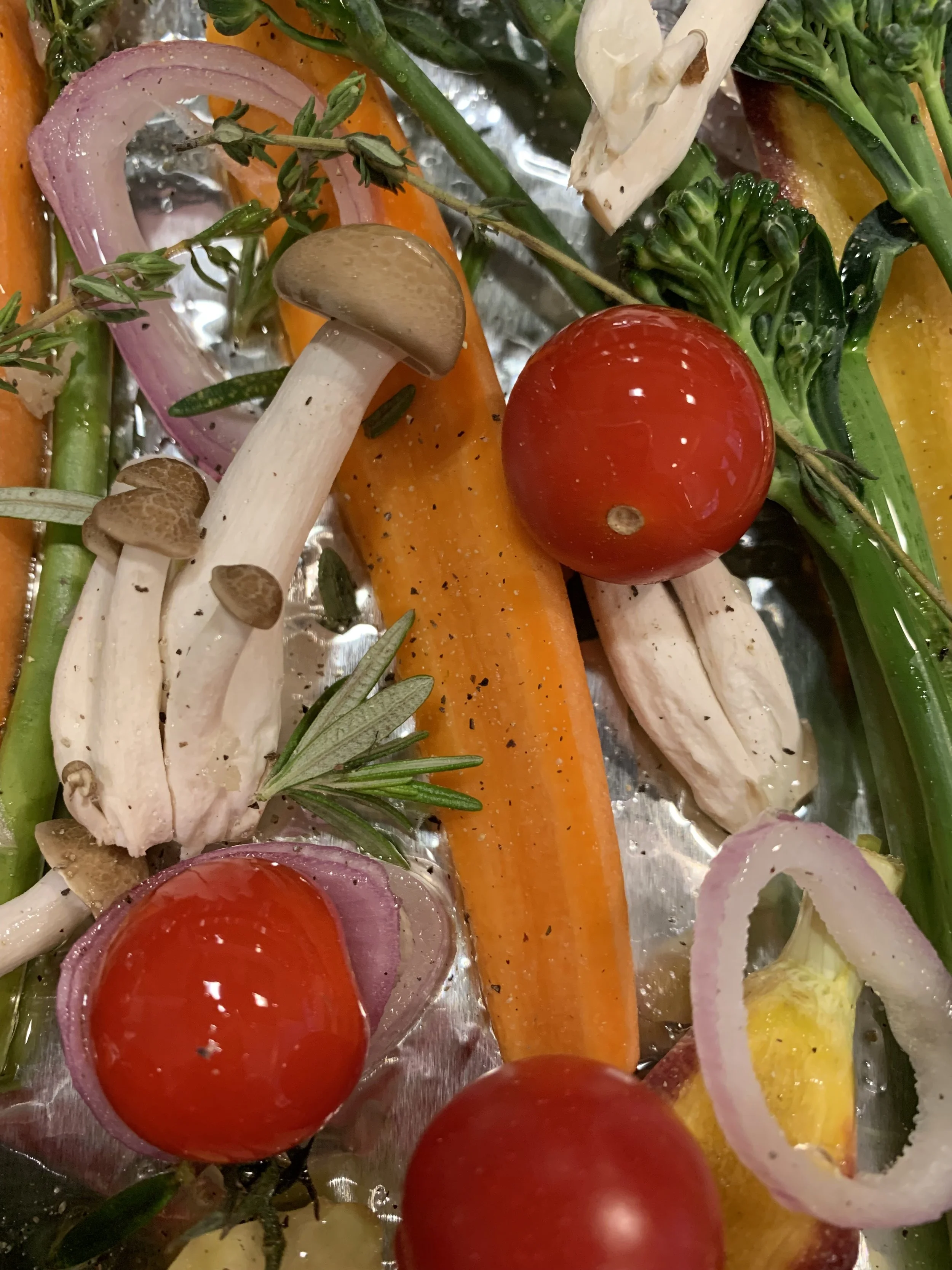 This is one of the easiest, quickest sides you can make. I found all the fresh, colorful veg at Trader Joe’s. I just kept pulling veggies out of my fridge to toss with olive oil, fresh garlic, salt and pepper. I mixed in fresh herbs - rosemary, thyme and sage. I roasted them on a foil-lined cookie sheet at 425 degrees for about 20-30 minutes. I included broccolini, asparagus, rainbow mini carrots, shallots, brown shimeji mushrooms, red peppers, and cherry tomatoes on the vine. For someone who has never liked mushrooms nor tomatoes, I actually liked these! We had the veggies with small filet mignon steaks (sometimes I’ll buy one steak and cut it in half, horizontally, for David to grill…it’s less expensive and enough for both of us)