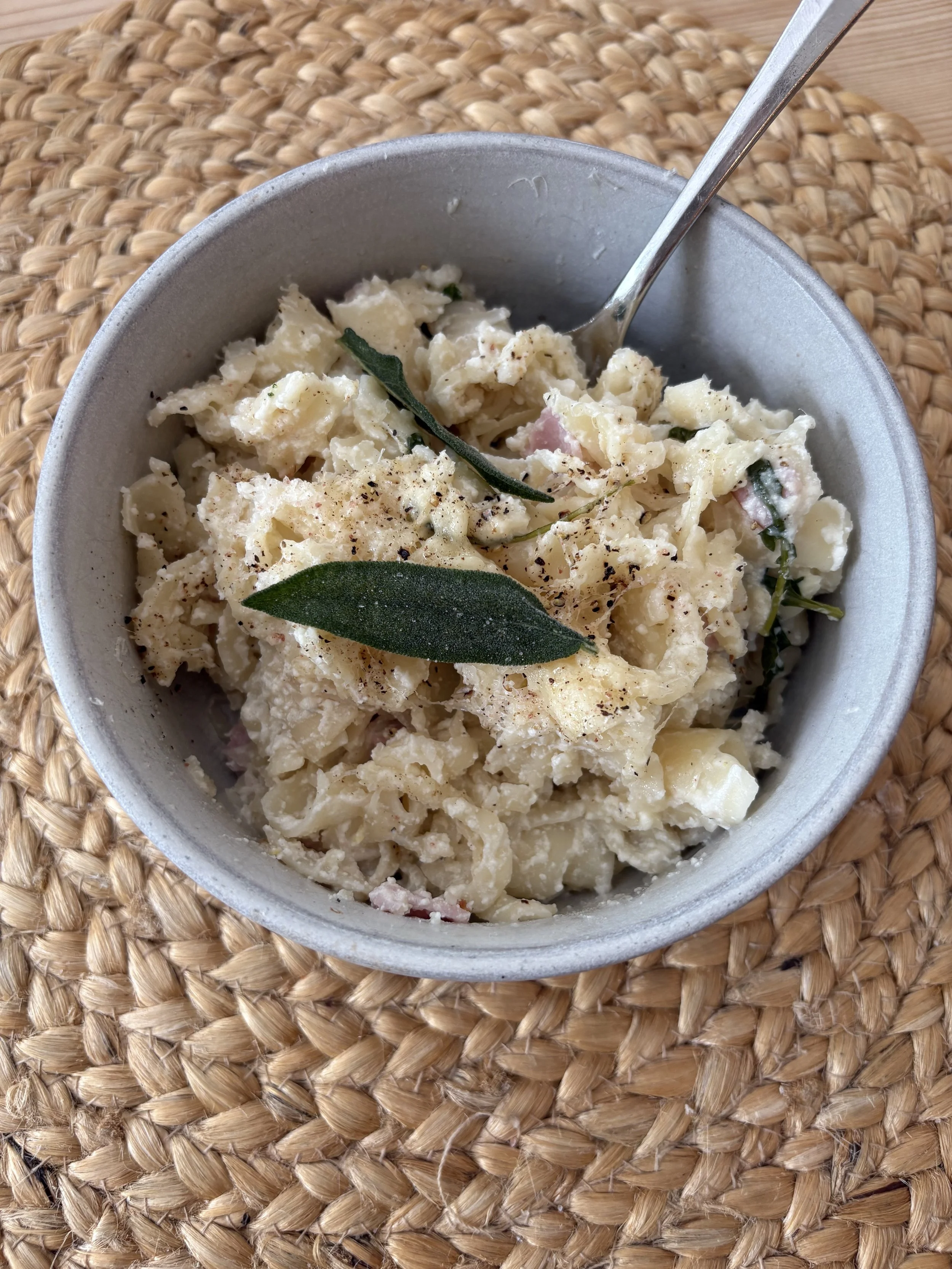 Once, I had a pasta dish at a Brooklyn restaurant with my daughter, Hannah, where there were crispy sage leaves on top of the pasta but I had never made them myself. Oh. my. word. Just make them. It’s stupid easy and soooooo gooood! Simply pour a little olive oil in a small skillet on medium heat, pop a few sage leaves in, let them sizzle for a couple of minutes, remove after they stop sizzling and place on a paper towel, sprinkle with a little pink sea salt and let them cool and crisp up. Amazing what a little herb can do to add a punch of incredible flavor to pasta!