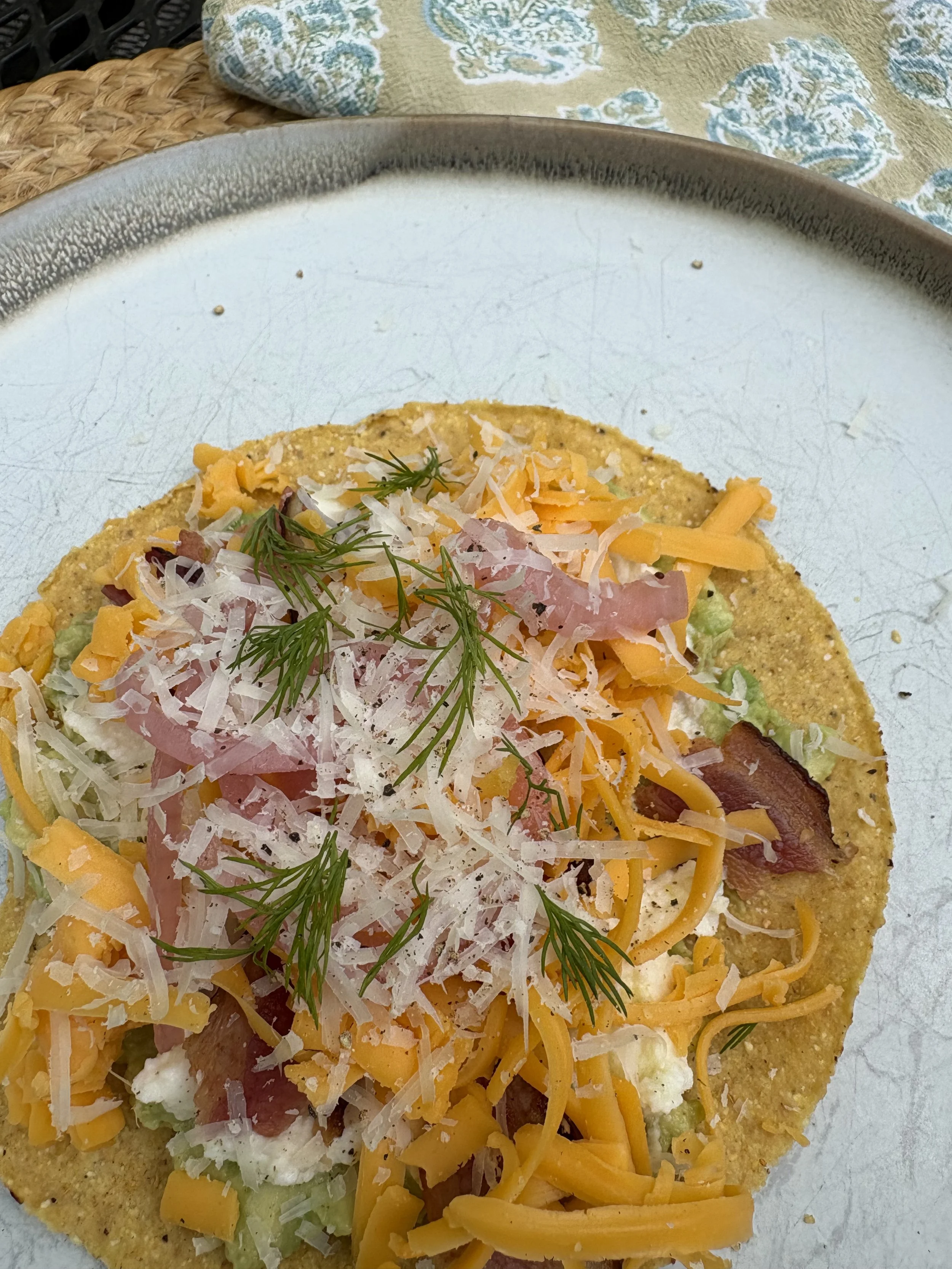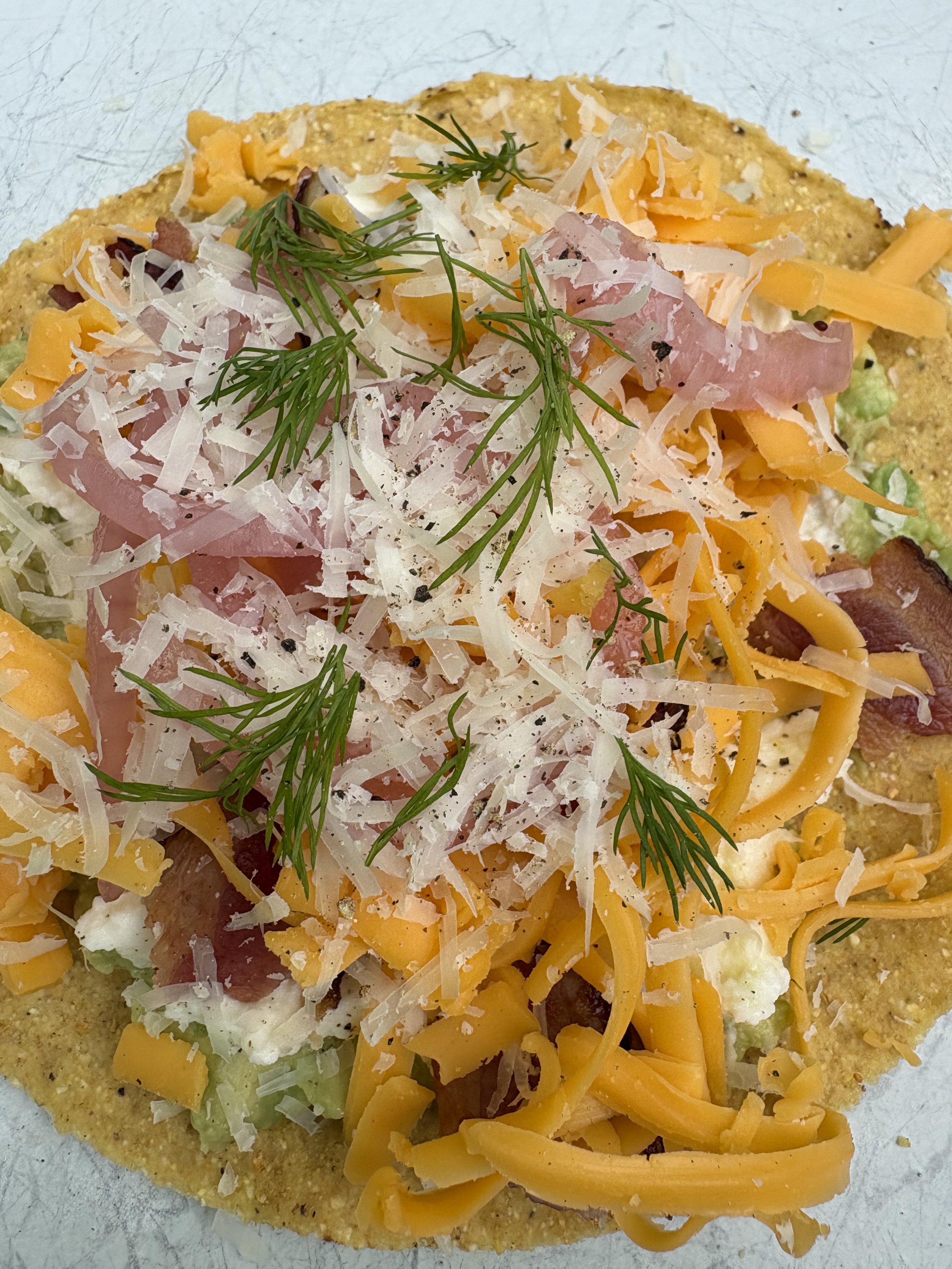 I have recently found these versatile crunchy tortillas save the day, time and time again. They can be topped with just about anything. When I don’t know what to make for dinner or aren’t craving anything in particular, if I have these little round gems, dinner is sorted. Or breakfast. Or lunch. I found these at Walmart and if you handle them with care in your buggy, at check-out and in the car, they will stay in one piece, for the most part. They do tend to break easily. I store them by themselves on a top pantry shelf. They’re fun to eat as a hand-held bite, and super quick to put together with spreads and toppings.