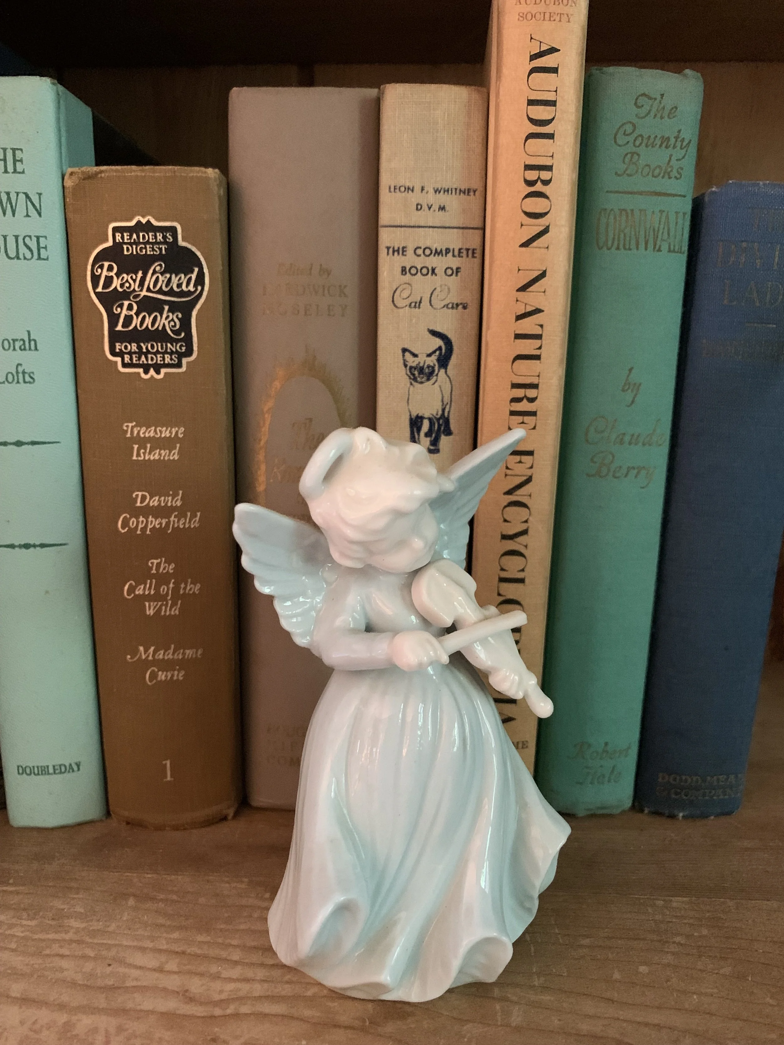 vintage books from antique shops and travels with a ceramic angel which played her violin in a secretary in my childhood home…I love to create a color palate in different shades, mixing objects which have a sentimental meaning or memory of a place, such as Cornwall..I found this book in an old, vintage bookshop in Falmouth