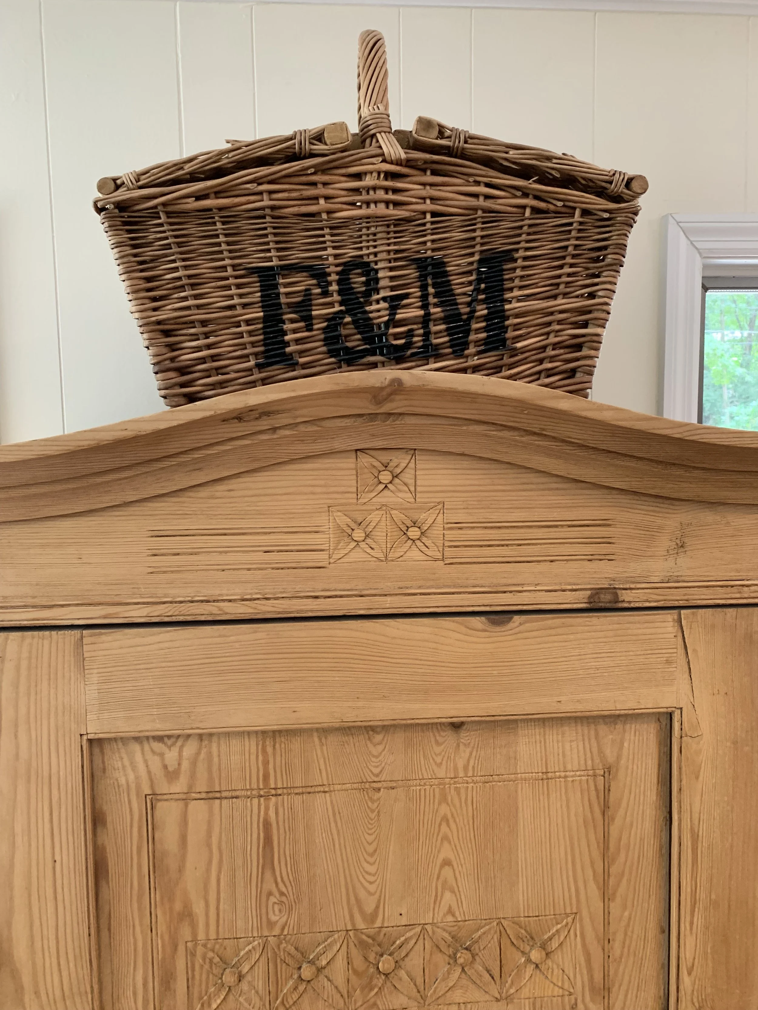 There are moments in your life when you are completely, overwhelmingly surprised by a gift. This basket was one of them. My sweet husband thoughtfully gave this Fortnum & Mason hamper to me as a Christmas gift a few years ago. I had no idea what was in the huge box and hadn’t asked for it. It was filled with teas, coffee, biscuits, candies, jams and crackers. He knew I fell in love with England when we visited. He knew how I loved wandering through the centuries-old F & M store in London. To have a little piece of that memory in our family room brings me much happiness. It perches atop an antique pine armoire I’ve had since I was a teenager. My parents bought it for me and we think parts of it might be from Holland or Sweden. It has held many things over the years but now holds games and such.