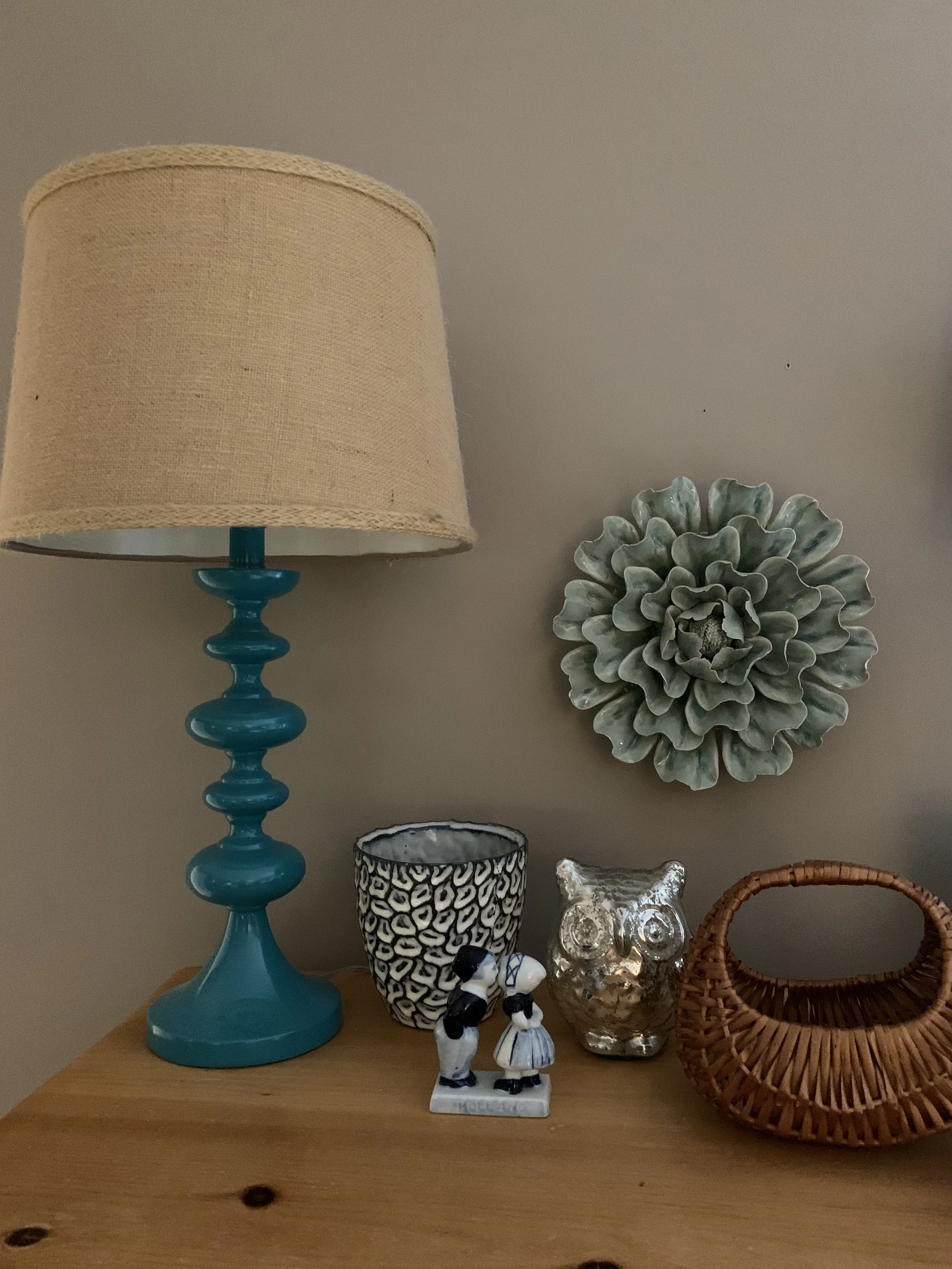 I like to make little groupings in similar shades of colors, like these blues. I love a mix of new and old, shiny and natural elements together. This lamp is from Target from years ago and I still love it! It’s a painted wood base with a burlap shade. The ceramic pot is from Sophie’s Shoppe and did have a plant in it at one time…need to find another one for it. The blue ceramic wall flower is also from Sophie’s and was a gift from my daughters years ago. The mercury glass owl is from Marshalls, I think, and is sentimental to me. I was a Chi Omega and the owl is its symbol. I wouldn’t have met my husband if I hadn’t been a member of that sorority, as a sister and friend introduced us. The basket was actually a little purse from my childhood. It had a red bandana lining at one time. How it survived all these years intact, I’ll never know but I adore it. The adorable ceramic kissing couple was in my parent’s home for years. I really don’t know where it came from but it says “Holland” on the base. These items sit atop our 33-year-old pine chest of drawers in our bedroom and I enjoy seeing them every day.