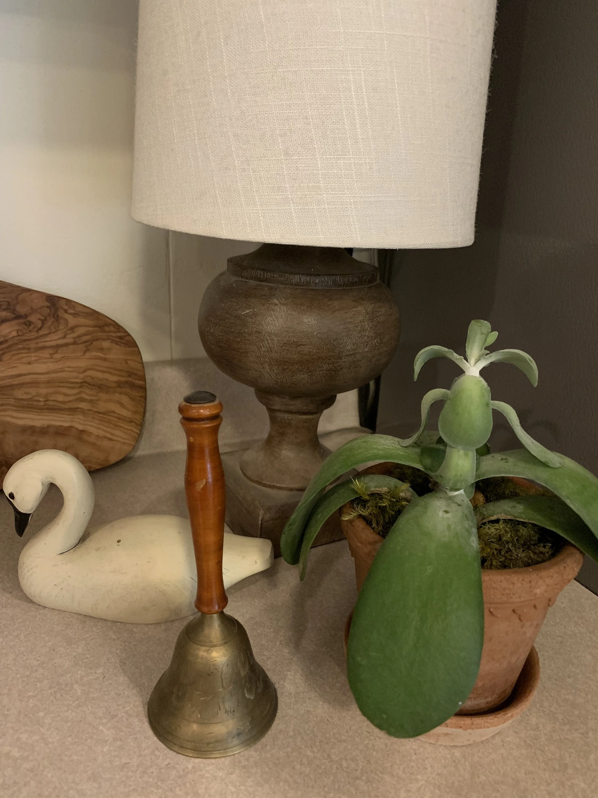 It’s sweet how just a few little items can make you smile when you see them everyday. The cutie lamp is from Target, the cutting board is a gift from my oldest daughter (more on that below), the clay pot and succulent is from a former preschool family (found at Signal Mountain Nursery), the brass bell is from my childhood home. I can’t remember a time when we didn’t have it and I cherish it, the wooden swan is from Shops on Main and a recent addition. I brought her home because she reminds me of our trip to England, where we saw several graceful, beautiful swans swimming on the Serpentine lake in Hyde Park. I’ve never seen so many swans in one place. She takes me back to London every time I look at her.