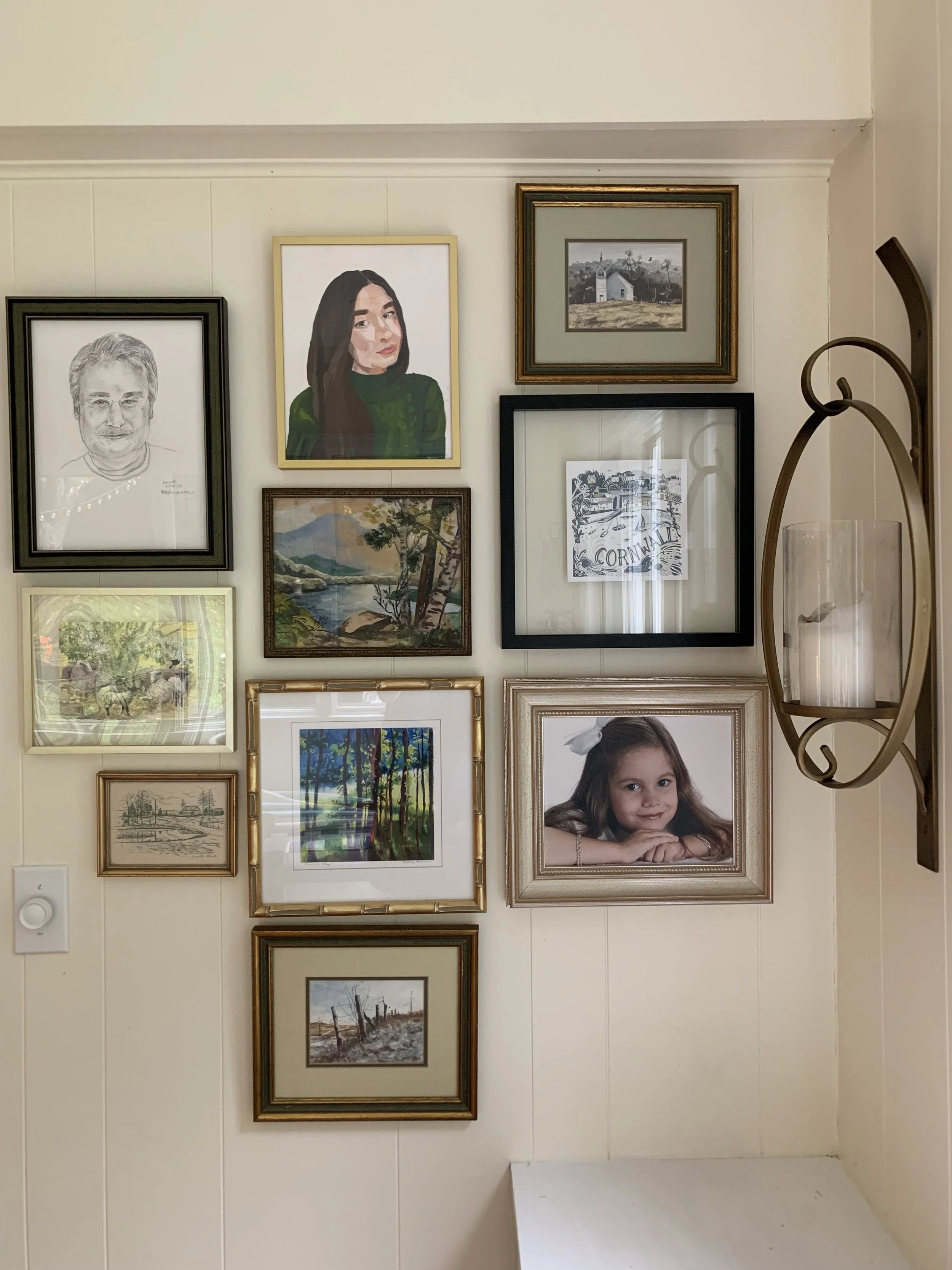 I love the look of gallery walls. It’s such a fun way to highlight many types of art in one space. I know there are ways to lay out artwork before hanging on a wall but we just kind of went for it and moved them as needed. I love the collected, informal look and displaying them in spots where you can enjoy them on a daily basis. It can also be a rather inexpensive way to fill the home with art. I tend to gather art which has a common color theme, but that’s just me. I think it’s also a way to express yourself and feature pieces that remind you of trips, loved ones who have passed on and those who remain. As with almost everything in our home, it’s a way to preserve and share memories.