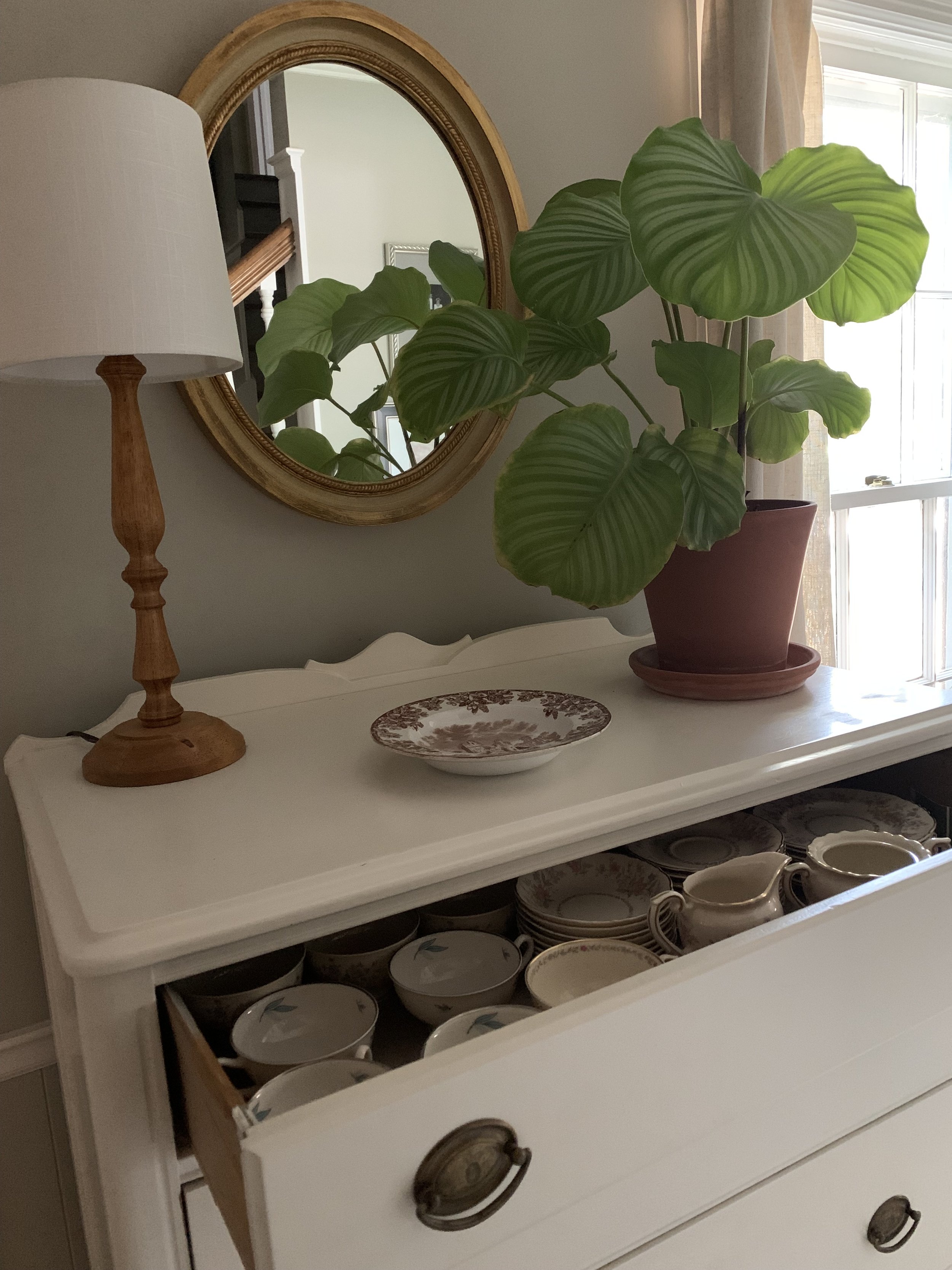 On the top, is a wooden lamp base from Pottery Barn, which we’ve had for decades, topped with a newish white linen shade from Target. The brown transfer ware bowl is an antique find, the plant (can’t remember the name of) is from Signal Mountain Nursery, as is the clay pot and the oval mirror was an antique mall find. When I found it, it was just an inexpensive frame. I took it to a glass company and they fitted it with the mirror. The colors of the wood remind me of some pieces of furniture we had in my childhood home.