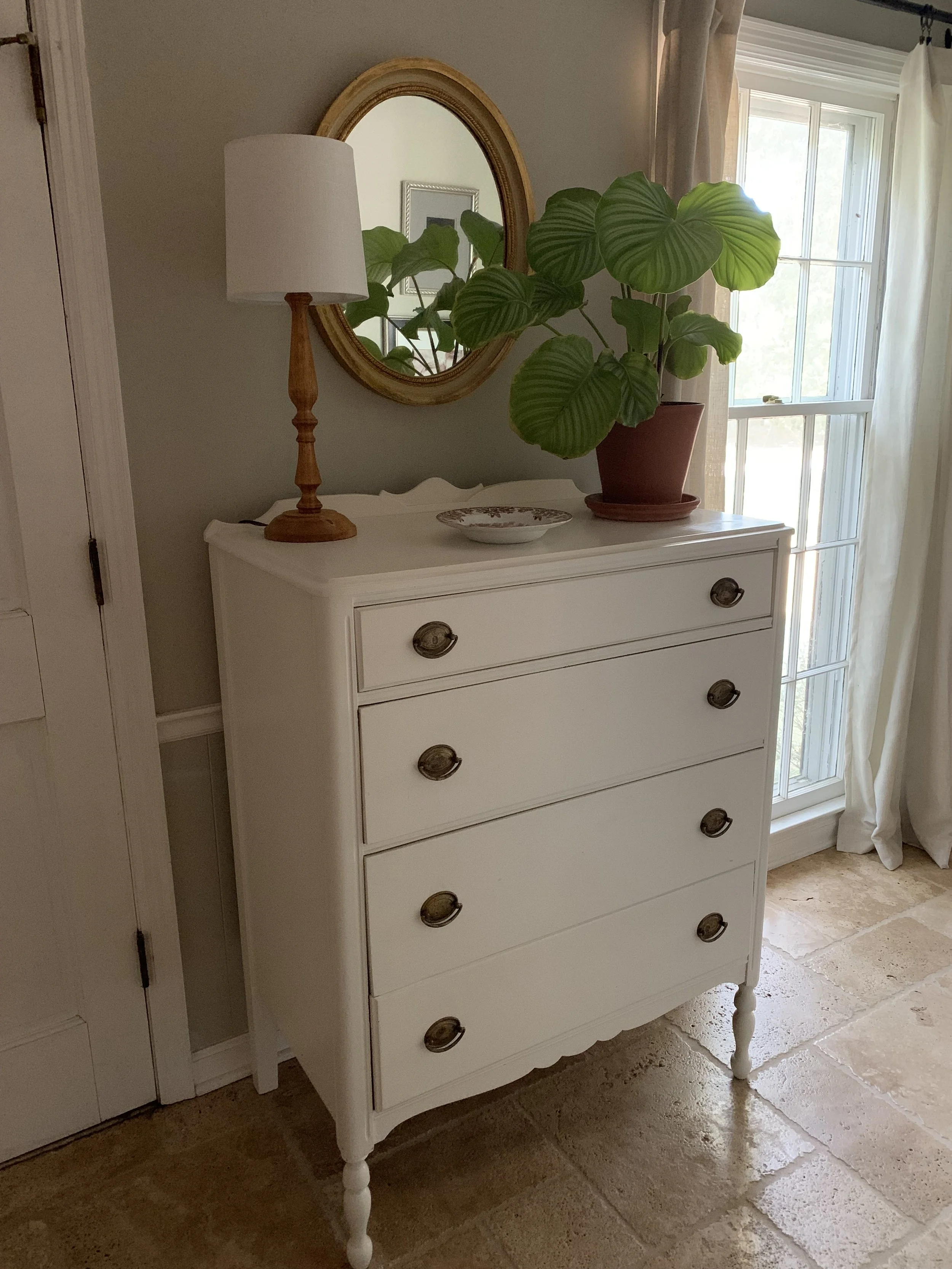 This cutie chest of drawers is likely at least 100 years old, if not older. It was in my daddy’s home when he was a child, moved to my teenage bedroom, our oldest daughter’s bedroom and now sits in our foyer. It’s been stripped and painted over the years. The last one to change it was my daddy when he painted it with enamel for our daughter’s room. Recently, we wanted to repaint it in a green tone but it would’ve been quite the job to strip and sand the enamel. So, we’ve left it the same white my daddy lovingly painted it all the years ago. It’s special to know when you touch it, his hands touched it, too.
