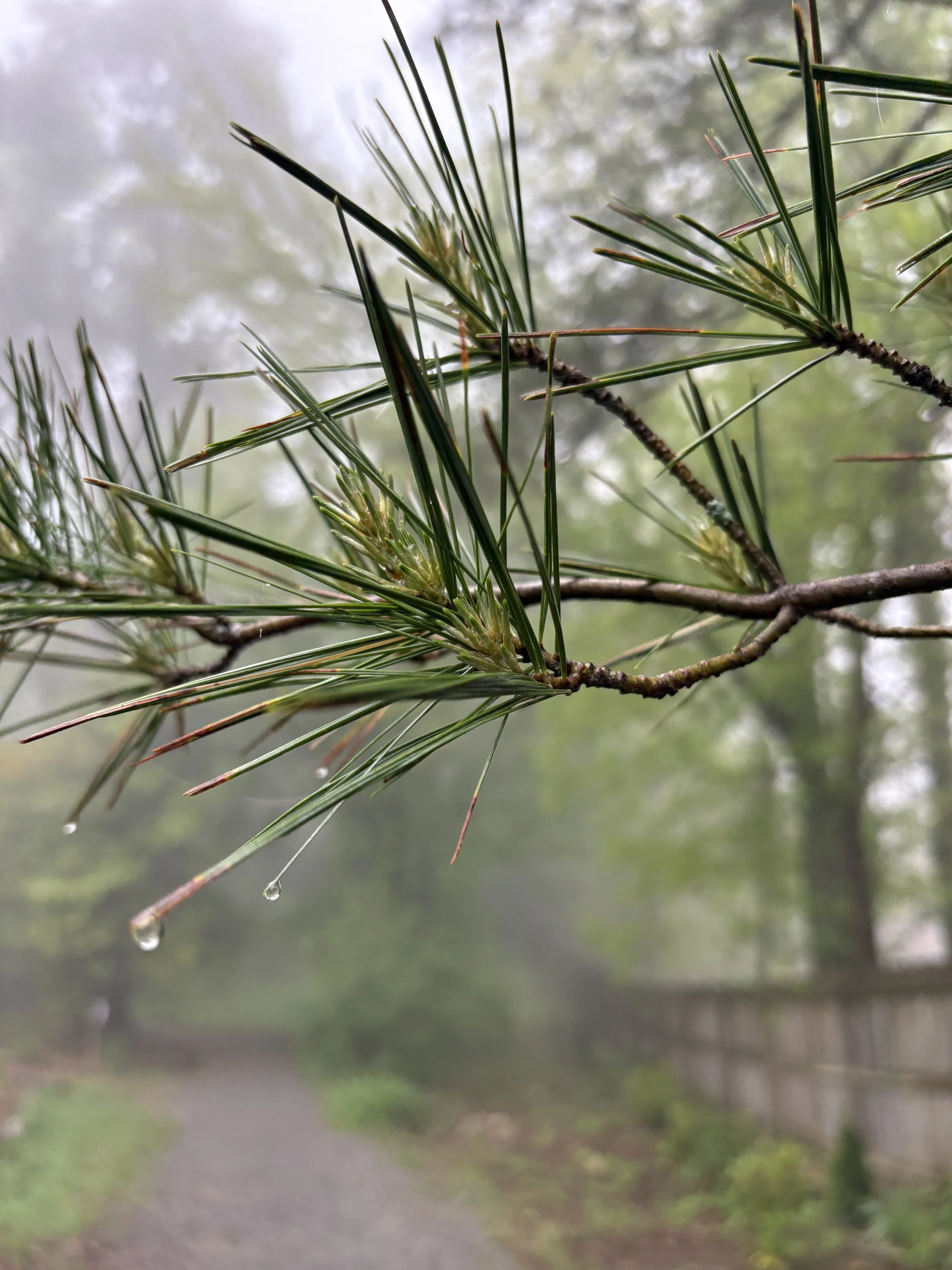 I love a sunny, blue-sky day but sometimes, when the fog rolls in and raindrops dangle from the trees and flowers, it’s rather enchanting.