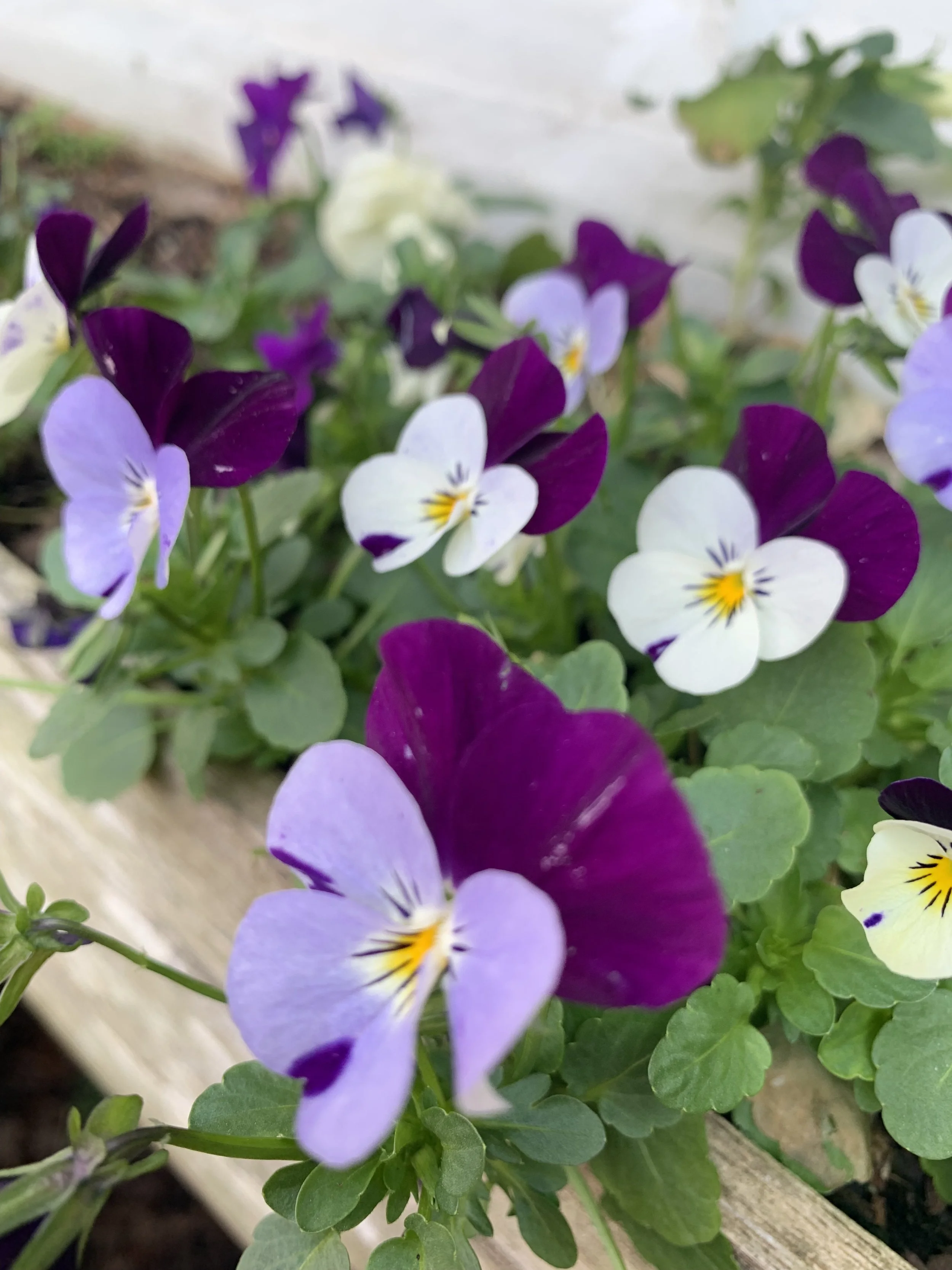 Our little violas survived the winter snows and have come back in our front window boxes. They smell so good…sort of a grape scent to me.
